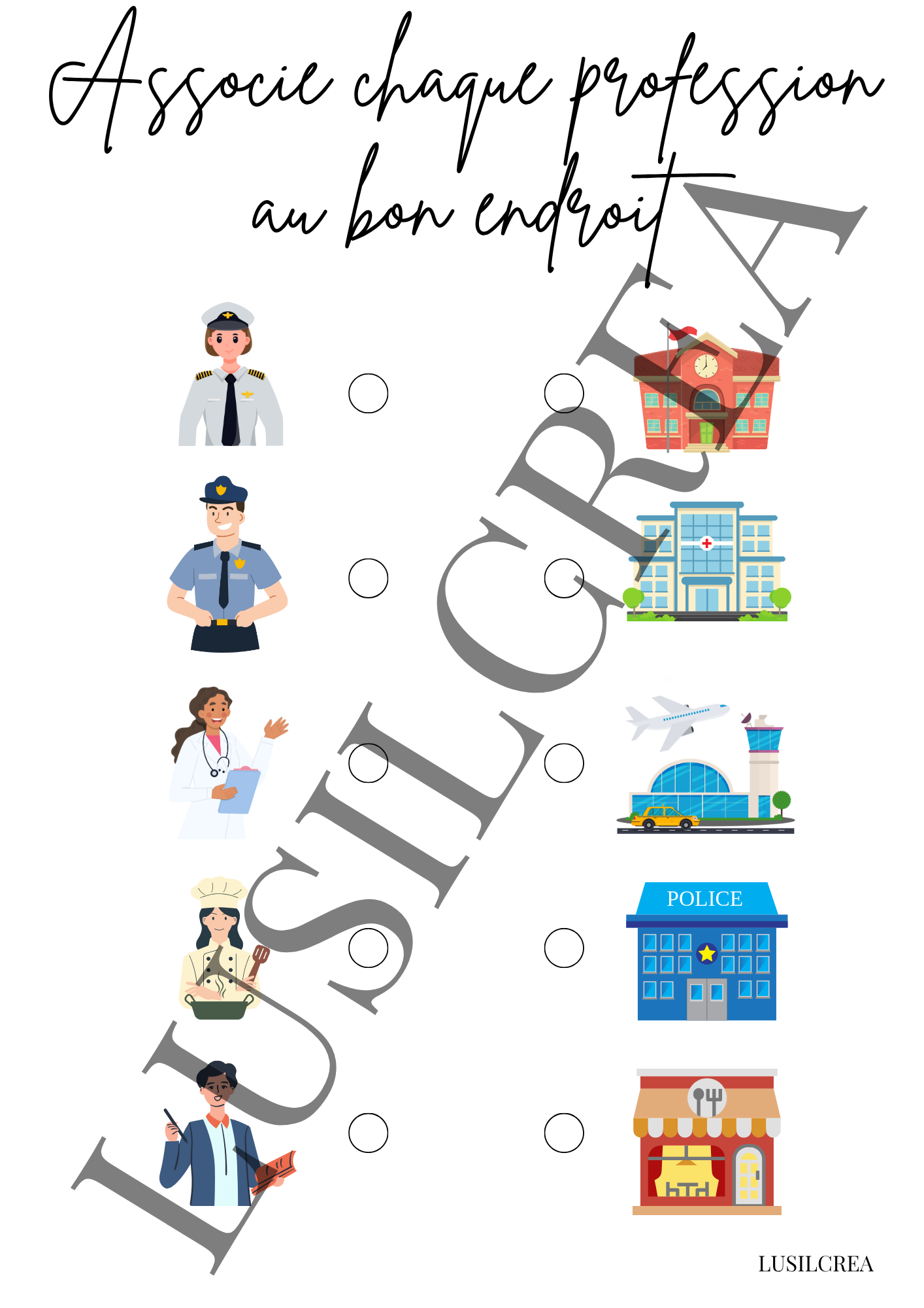 Elle contient 5 éléments à relier, représentant des professionnels à associer à leur bon endroit.
