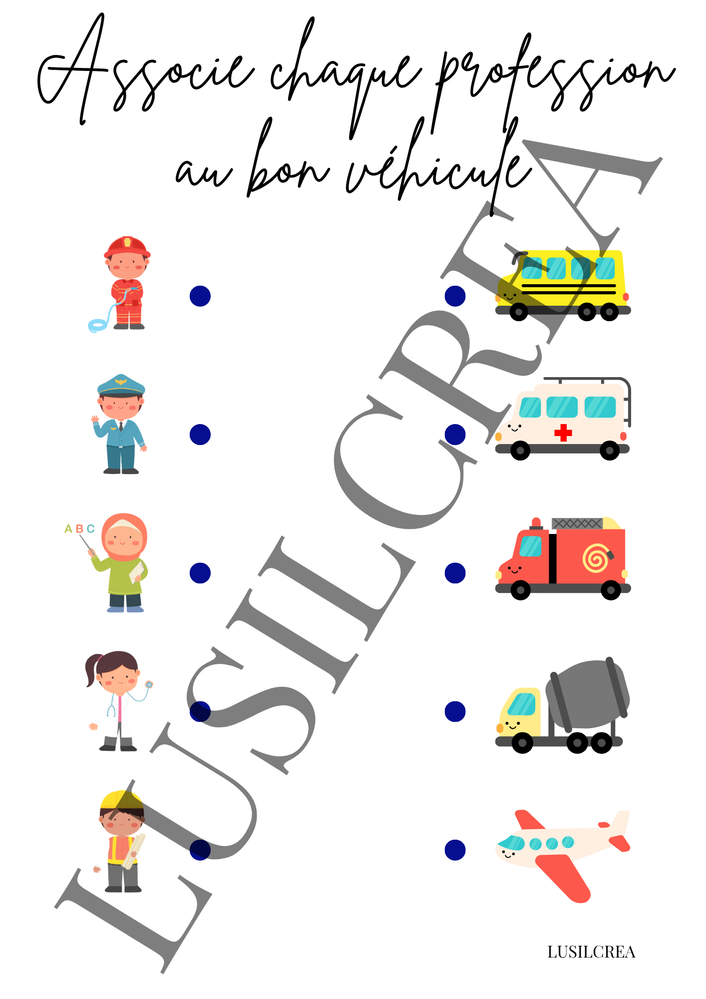 Elle contient 5 éléments à relier, représentant des véhicules professionnels à associer à leur personnage ou métier correspondant.