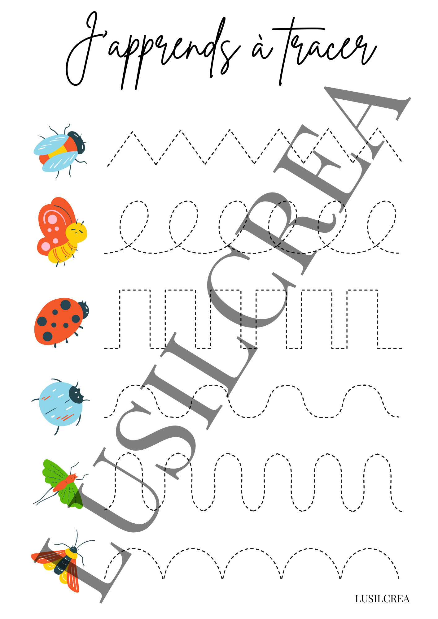 Cette page contient 6 éléments pour s’initier aux premiers tracés : lignes droites, courbes, pointillés, zigzags, boucles, etc.