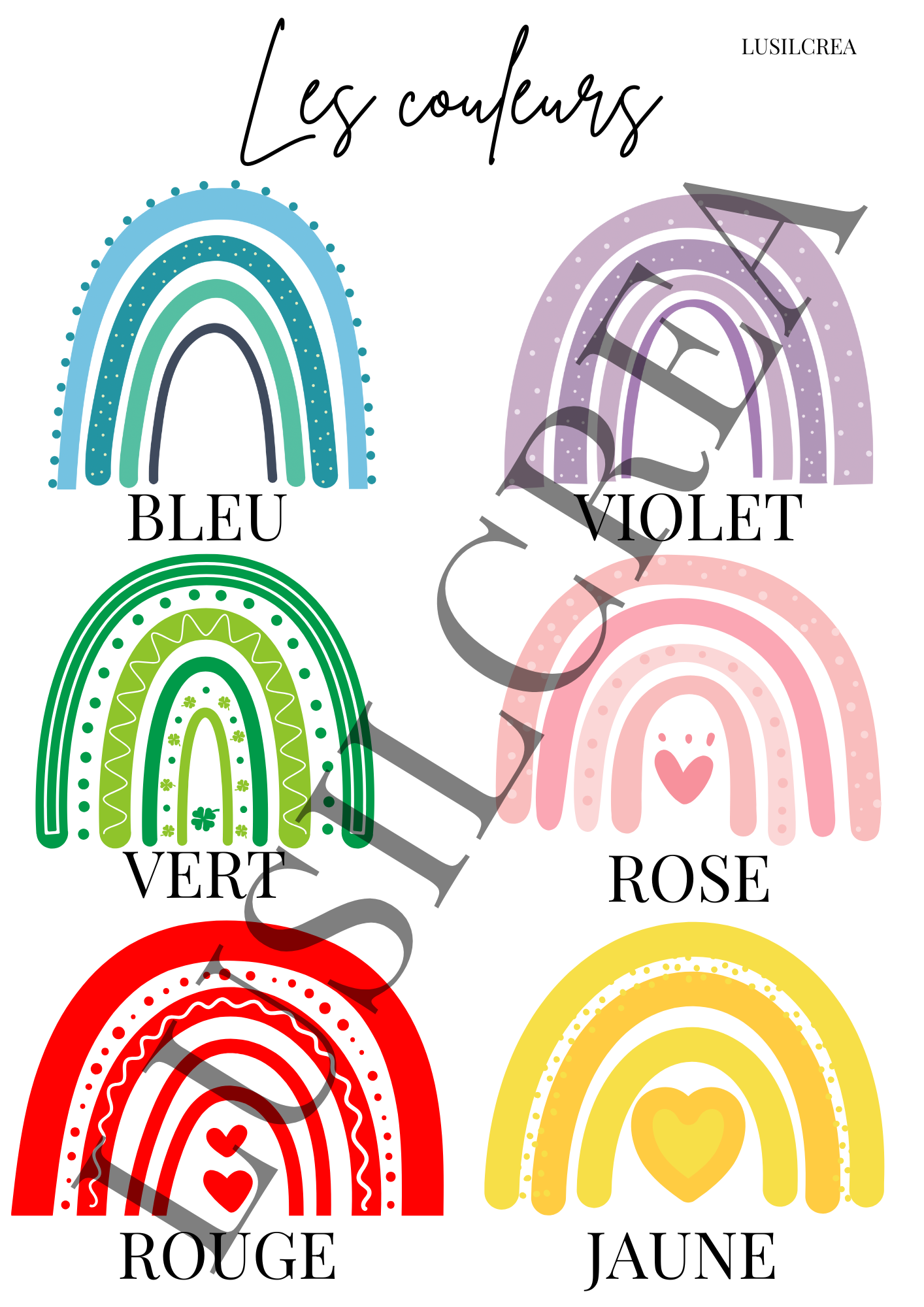 Une page joyeuse et lumineuse pour apprendre à reconnaître, nommer et classer les couleurs de l’arc-en-ciel.