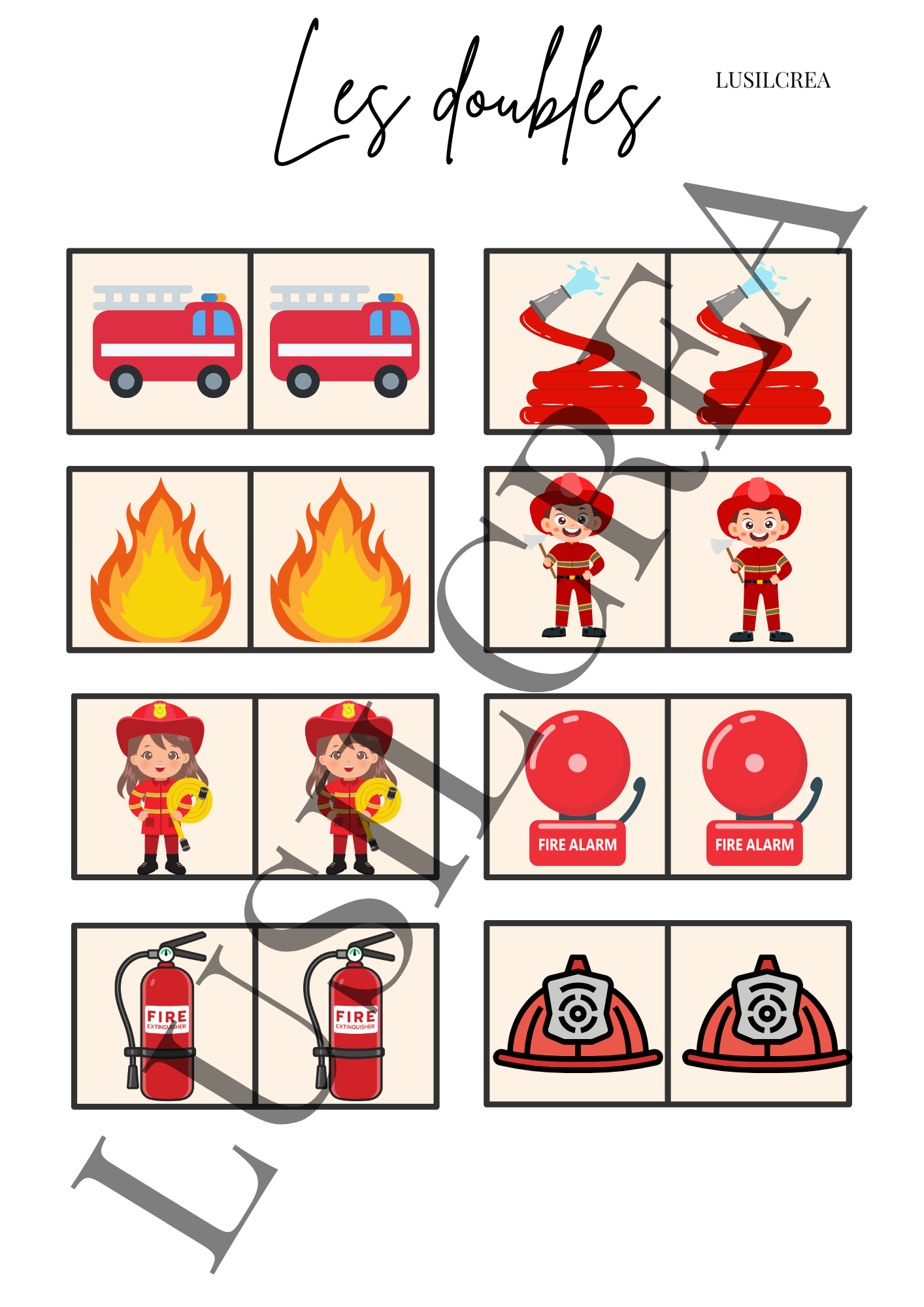 Elle contient 6 éléments à scratcher à retrouver en double : casque, camion, lance à eau, extincteur, sirène, tenue…