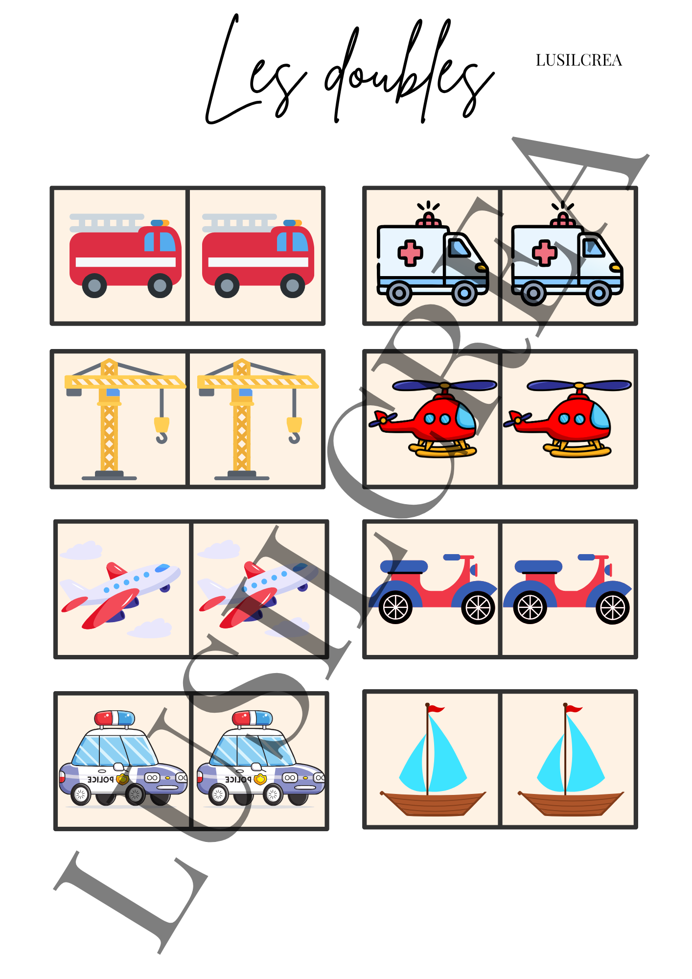 Une page d’observation et de logique pour apprendre à former des paires identiques autour du thème des véhicules.