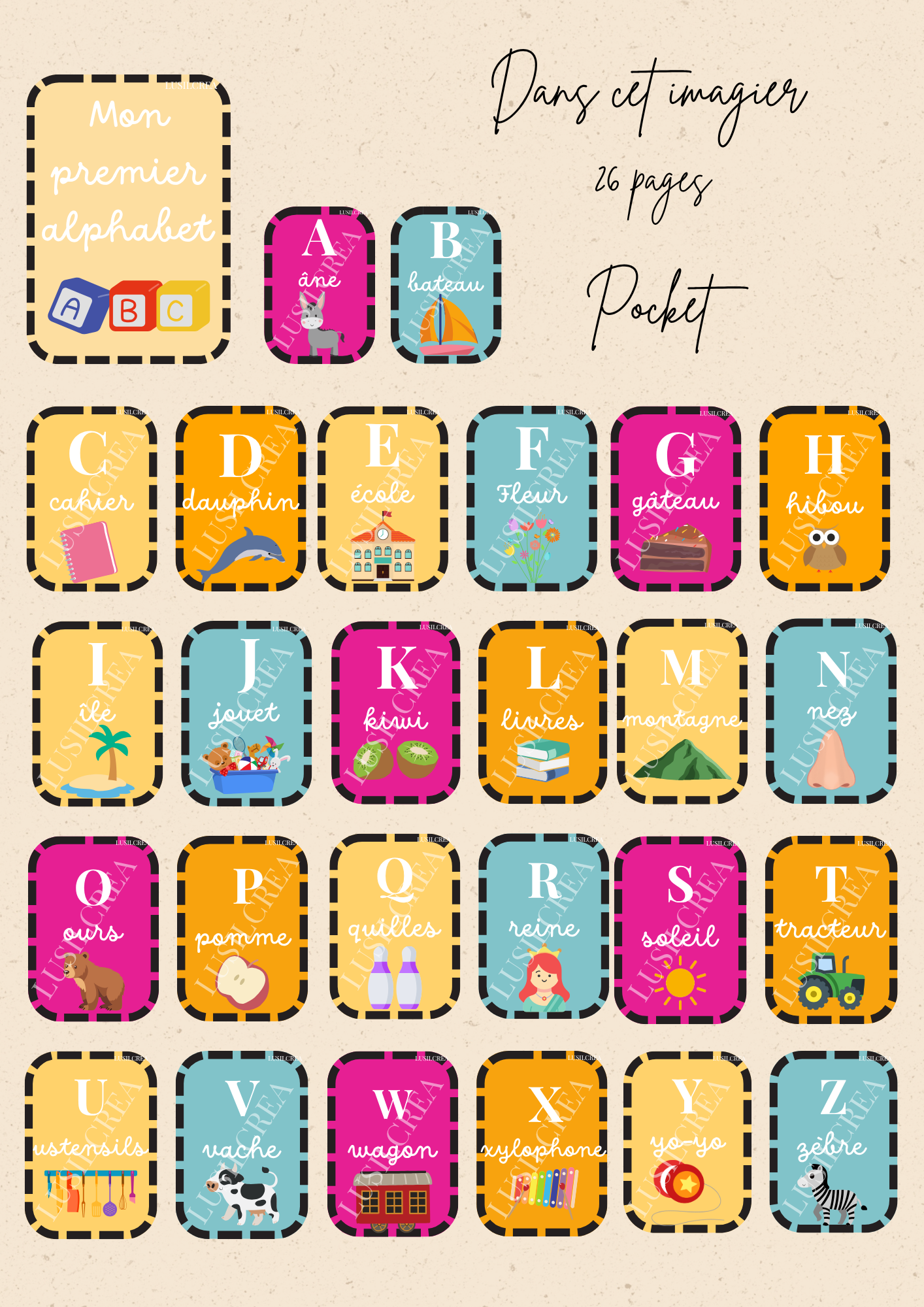 Composé de 26 pages illustrées, ce livret accompagne l’enfant dans l’apprentissage des lettres en associant chaque lettre à une image claire, colorée et facile à reconnaître.